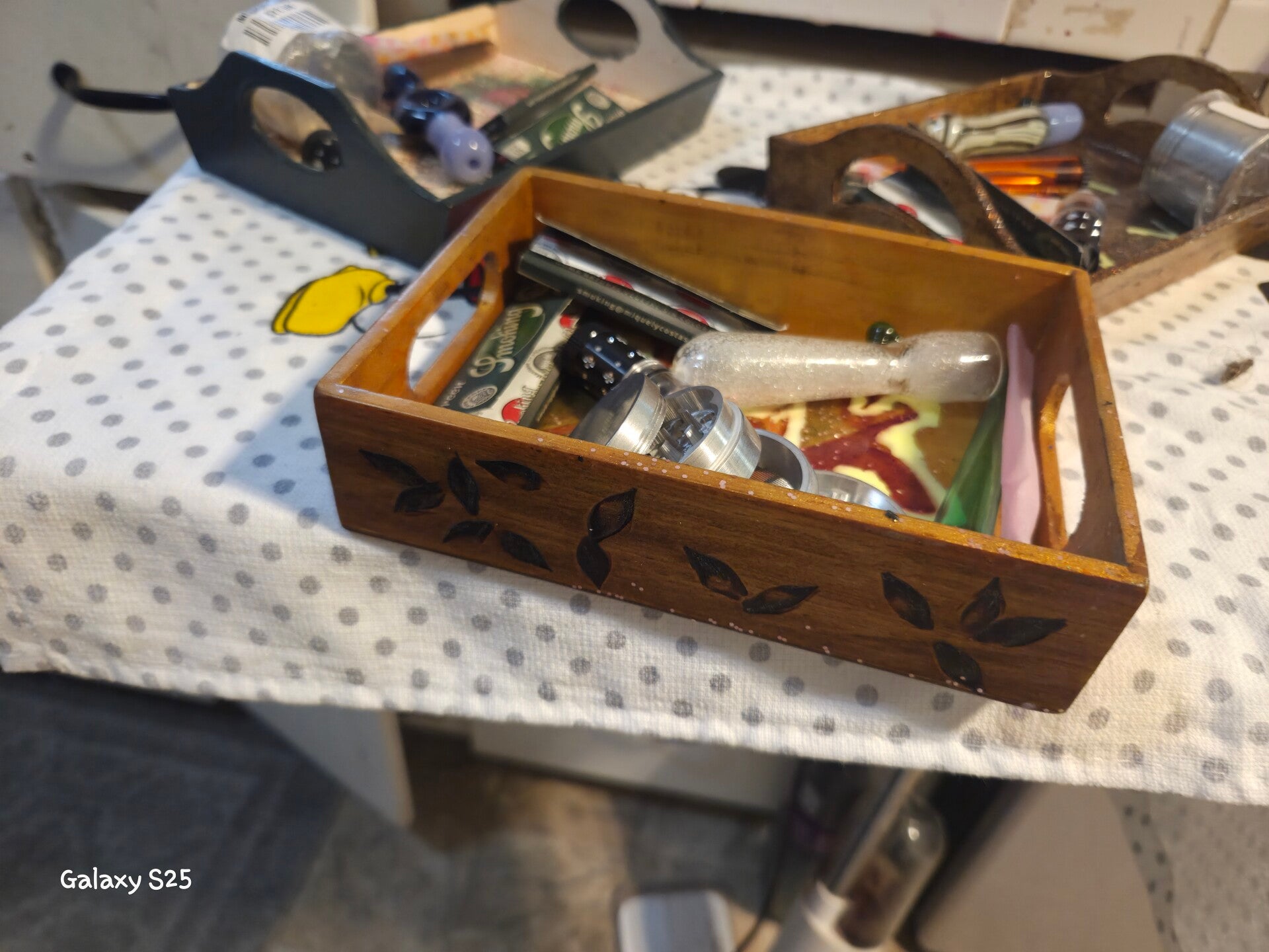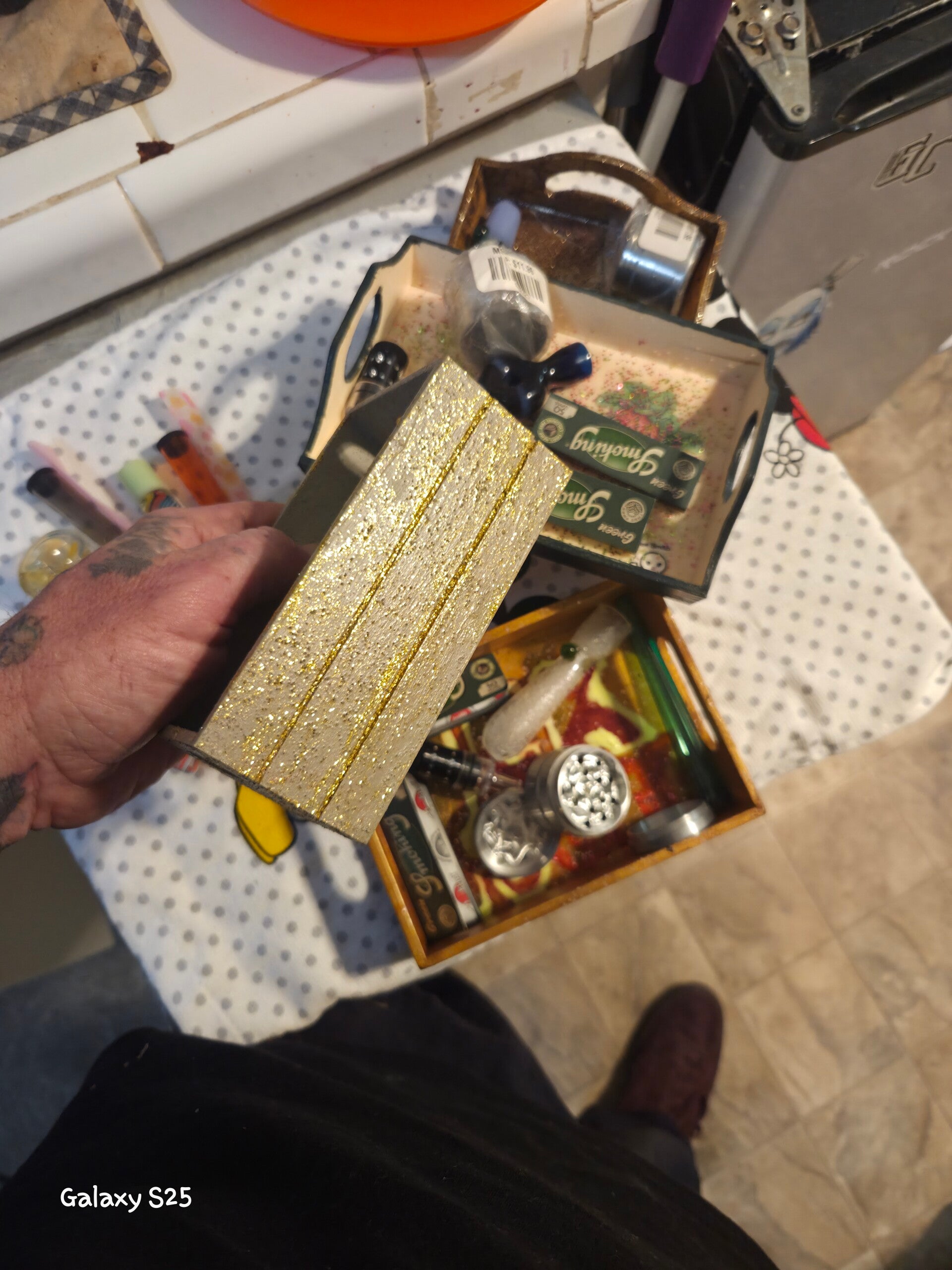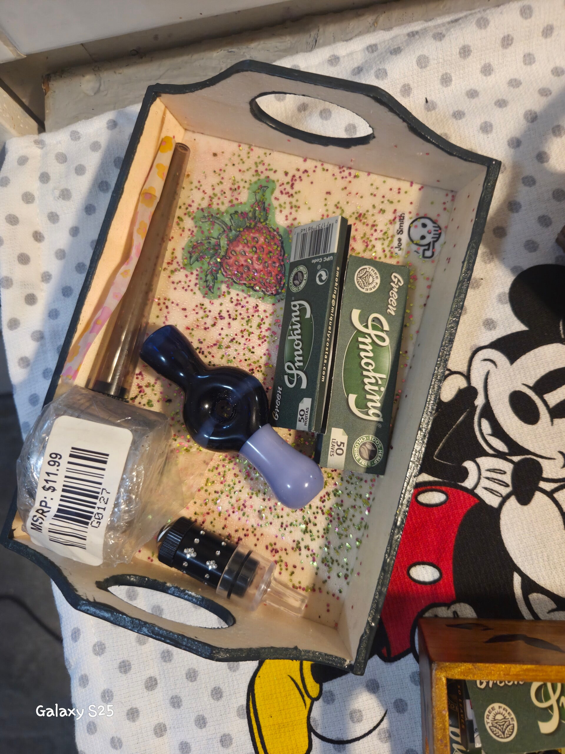 This is really the best bang for your buck. let me put you together a kit wsith custom made rolling tray, pipes papers grinder...pretty much whatever i can stuff in there for you. I promise youll be happy. you can also give me some suggestions and ill make it special for you.