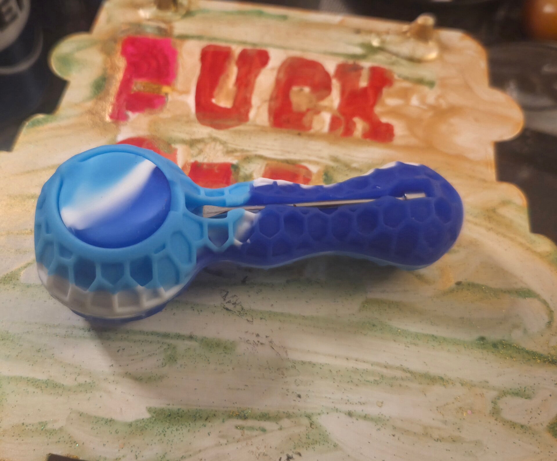 Perfectly sized silicone pipe with little stash spot on the bottom , putting your wax or shatter. Even comes with a little dab tool.