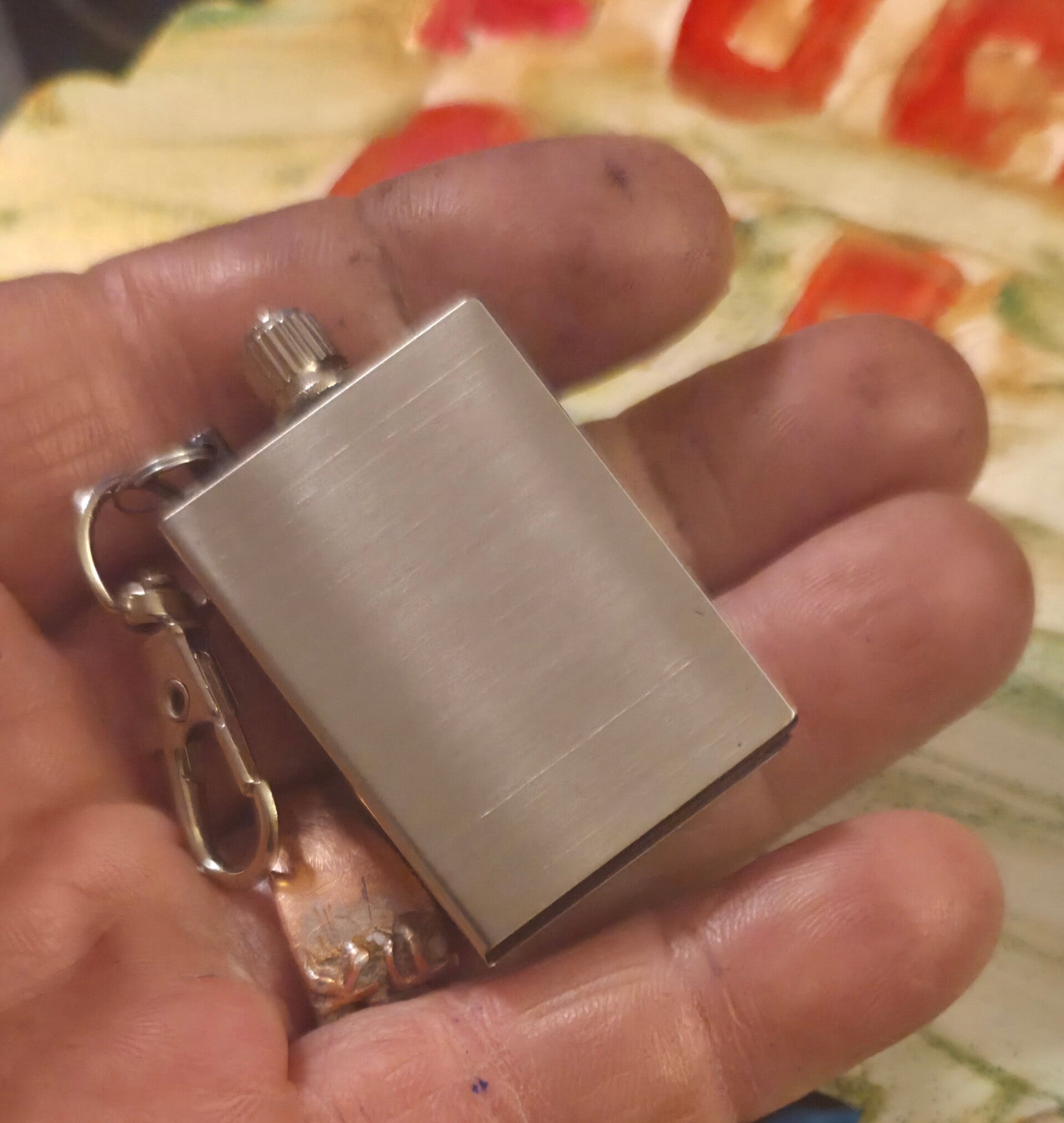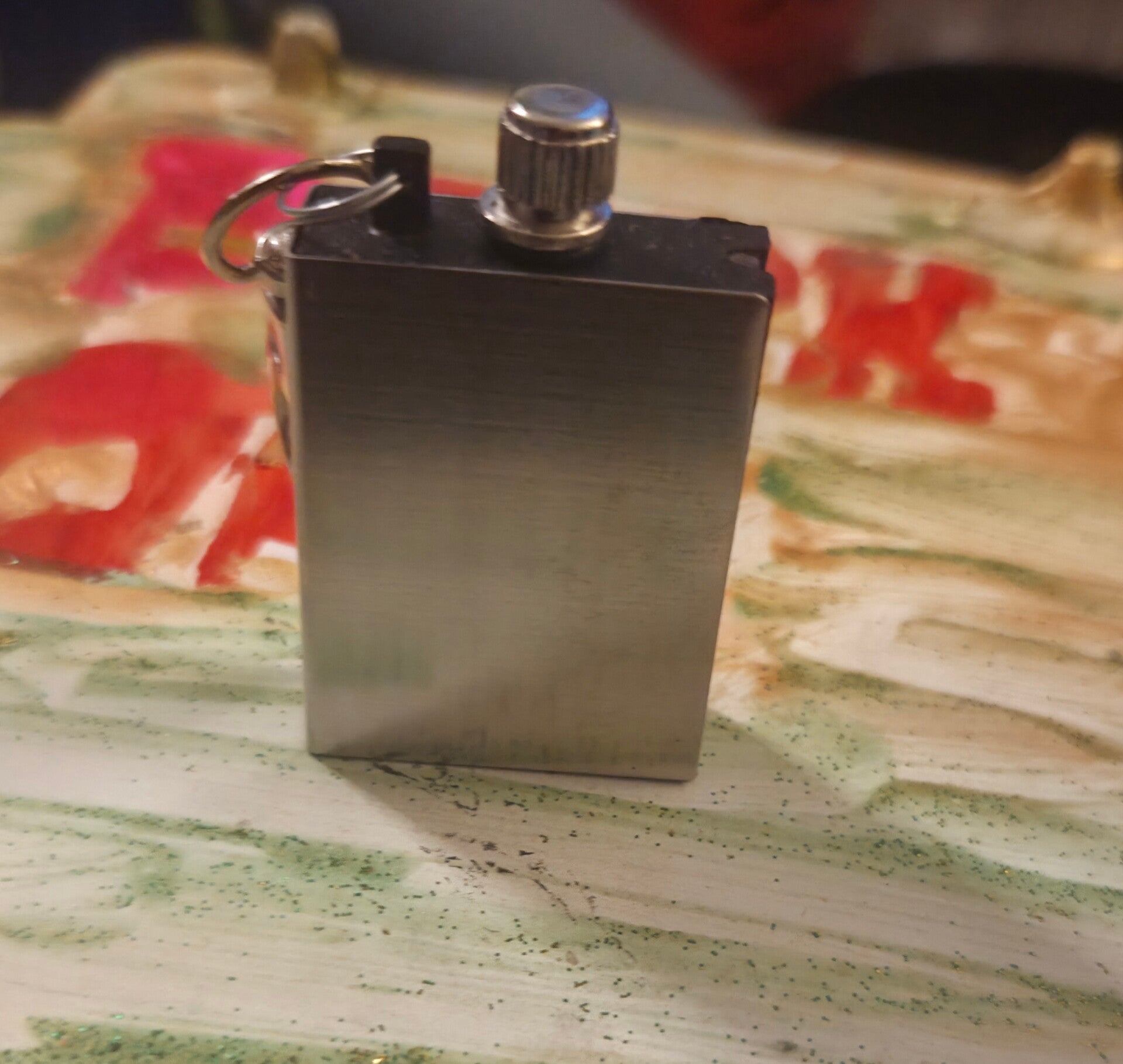 This is an interesting device.You feel it full of lighter fluid.Take the match from inside and strike the side of the container.And bingo , you have a match that stays lit. Size perfect for the tea chain.